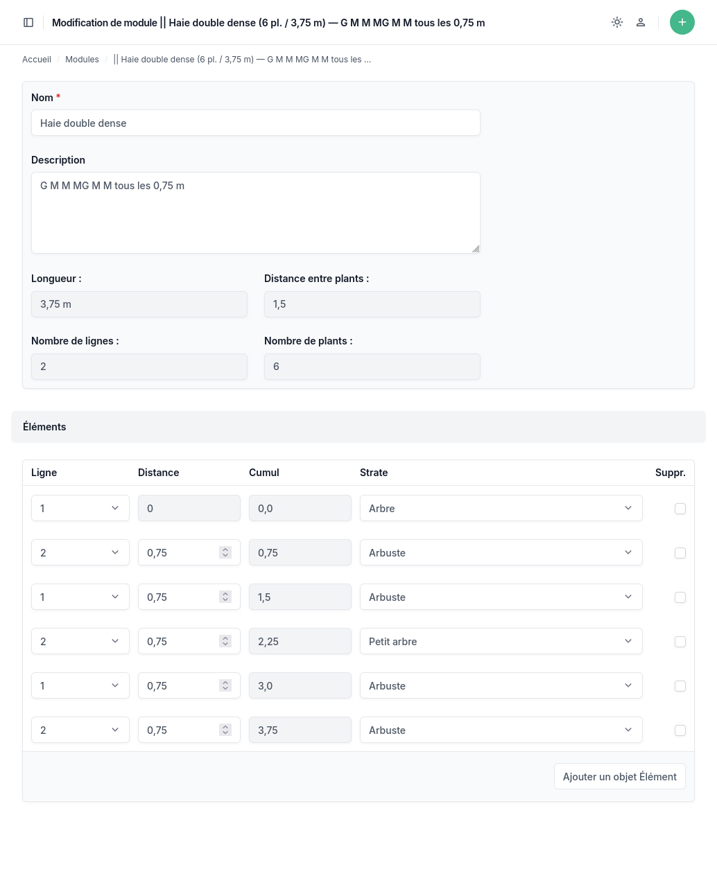Les modules représentent une suite de plants définis selon leur strate (Arbre, Arbuste, Arbrisseau...). On ne va pas parler directement d'espèce à ce niveau. L'idée est de définir une séquence qui sera répétée x fois le long d'un aménagement linéaire.