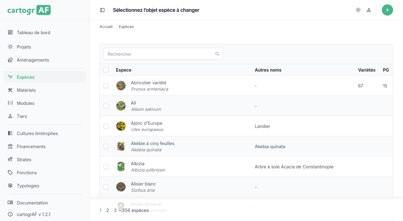 L'application intègre une liste non exhaustive d'espèces avec leurs noms communs et latin. Pour certaines espèces, notamment fruitières, des variétés et portes-greffes ont été ajoutés.